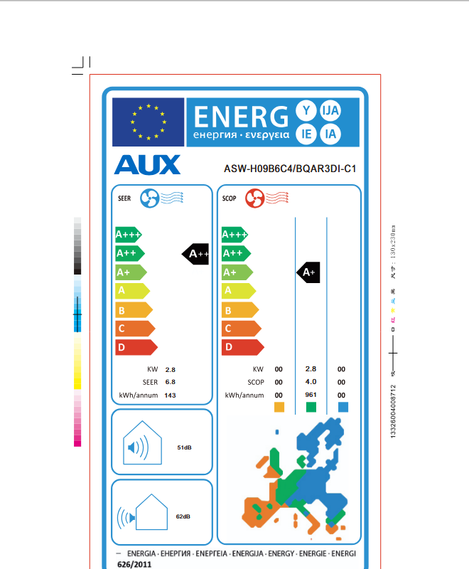 - Годишен разход на електроенергия (Охлаждане / Отопление):143 / 961 kWh