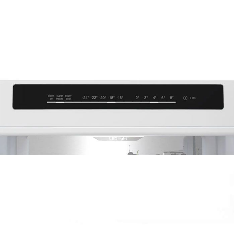 - Вид на устройствата за настройка и сигнализация Супер настройка на фризер, Супер настройка на хладилник, Температура за фризер, Температурен дисплей за хладилник, Предупредителна сигнализация за фризера, Предупредителен сигнал за неизправност, Предупредителен сигнал за отворена врата